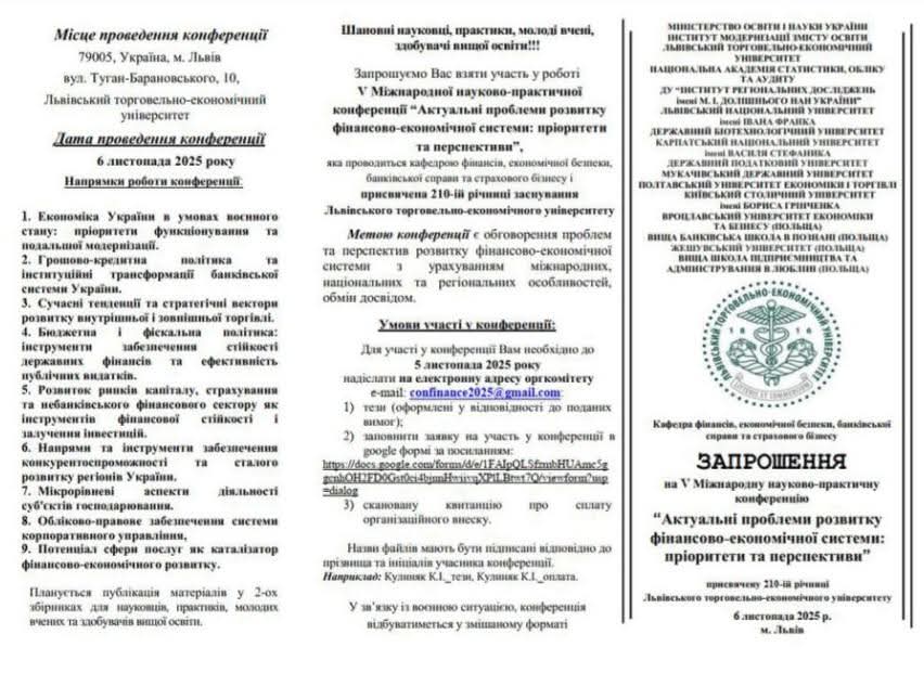 6 листопада 2025 року у Львівському торговельно-економічному університеті на кафедрі фінансів, економічної безпеки, банківської справи та страхового бізнесу відбулася V Міжнародна науково-практична конференція «Актуальні проблеми розвитку фінансово-економічної системи: пріоритети та перспективи».